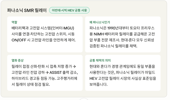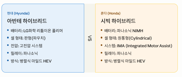 핵심 요약: 아반테 하이브리드와 시빅 하이브리드는 모두 마일드 병렬식 하이브리드로 동작 방식이 동일합니다. 차이는 배터리 셀 기술 — 아반테는 LG화학 리튬이온 판형(파우치), 시빅은 파나소닉 원통형 NiMH를 사용합니다. 두 차량 모두 파나소닉 릴레이를 공통으로 사용하며, 계기판 ASSIST·CHARGE 표시 방식도 동일합니다.