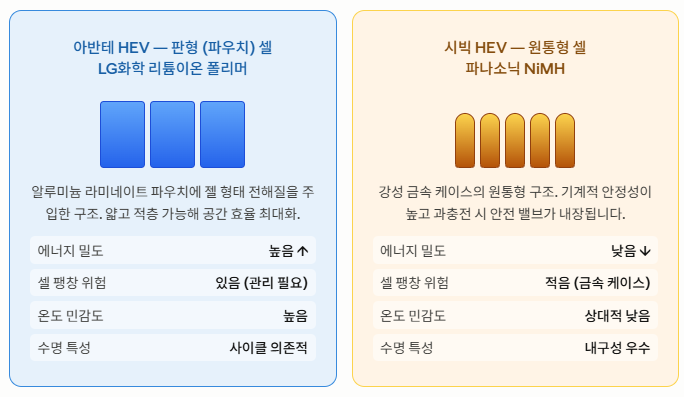 아반테 하이브리드와 시빅 하이브리드는 배터리 셀 기술이 다르지만, 마일드 병렬식이라는 동작 방식이 동일하기 때문에 동일한 구조적 한계를 공유합니다.