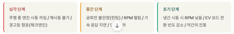 · 하이브리드 차량: 잦은 저온 운행 특성으로 7~8만 km마다 점검 권장