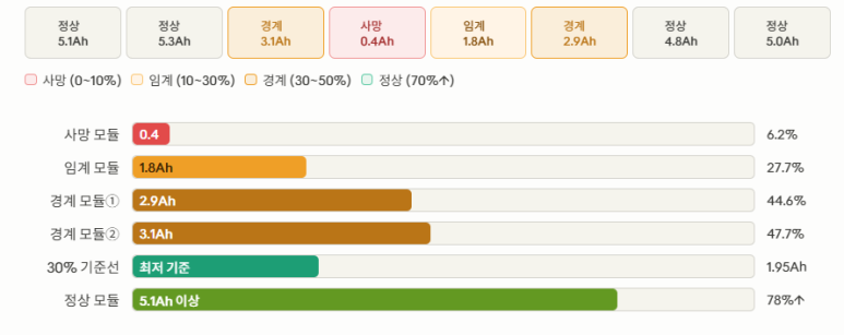 전용 진단 장비로 배터리팩 전 모듈을 개별 용량 측정한 결과, 팩 중앙부에 위치한 모듈 1개가 0.4Ah를 기록했습니다. 정격 용량 6.5Ah 대비 6.2% 수준으로, 사실상 배터리로서의 기능을 상실한 상태입니다.