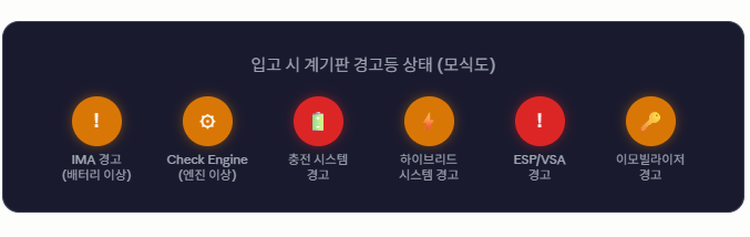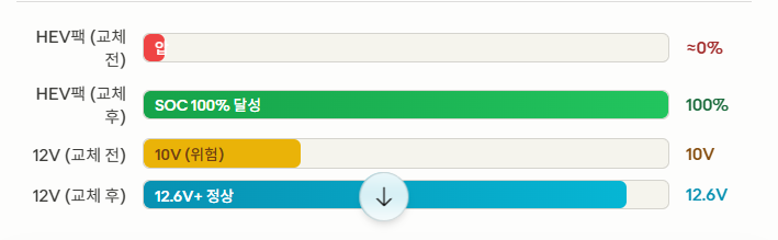 왜 경고등이 한꺼번에 켜지나: 12V 배터리가 10V까지 낮아지면 차량 내 ECU들이 리셋되거나 저전압 오류를 기록합니다. 재시동 시 모든 ECU가 동시에 자기진단을 시작하면서, 각자가 발견한 오류 코드를 계기판에 동시 점등합니다. 이때 표시되는 경고등 대부분은 실제 해당 부품의 고장이 아니라 12V 전압 불안정에서 파생된 '연쇄 오류'입니다. 12V 배터리와 HEV 팩을 교체하고 코드를 초기화하면 대부분 소거됩니다.