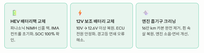 Battery Coach 한마디: 배터리팩만 고쳐도 하이브리드 기능은 돌아옵니다. 하지만 16만 km 동안 쌓인 엔진 흡기 카본을 그대로 두면 새 배터리의 ASSIST가 막힌 엔진을 돕느라 더 빨리 소모됩니다. 배터리와 흡기를 함께 정비하면 새 차가 두 대 생기는 효과입니다.