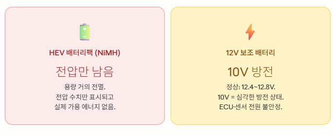 점프 시동이 필요했던 이유: 12V 보조 배터리가 10V까지 하락하면 ECU·BCM·각종 센서의 최소 작동 전압(약 10.5~11V)에 근접하거나 미달합니다. 이 상태에서는 스타터 모터를 구동할 전력이 없어 정상 시동이 불가능합니다. HEV 배터리팩 방전과 12V 배터리 방전이 동시에 발생하면 차량 전체가 완전히 먹통 상태가 됩니다.