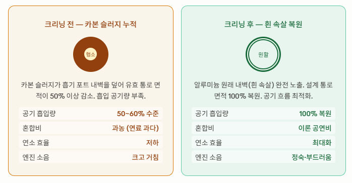 흡기 포트 분해 후 카본 슬러지 완전 제거. 알루미늄 원래 내벽(흰 속살) 복원. 조립 후 엔진 소리 완전히 달라짐.