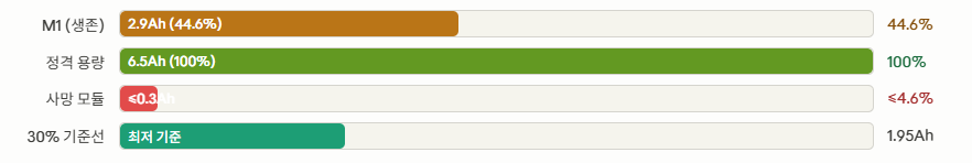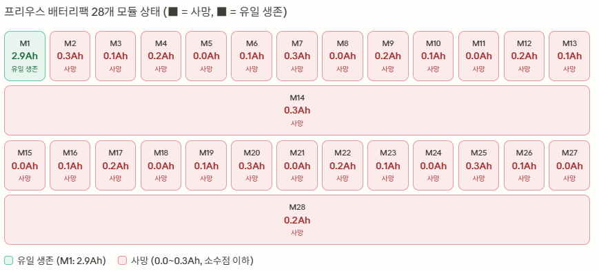 28개 모듈 중 27개 사망 (소수점 이하 용량). 유일 생존 M1도 2.9Ah (44.6%)로 정상 기준 이하. 전체 팩 교체가 불가피한 상태. 과열 위험이 임박해 있었음.