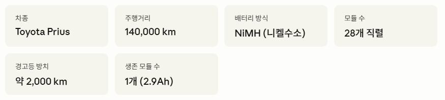 - 14만 km 프리우스 기준, 경고등 점등 초기에 3~5개 모듈 교체로 수십만 원에 해결 가능 → 조기 발견의 가치