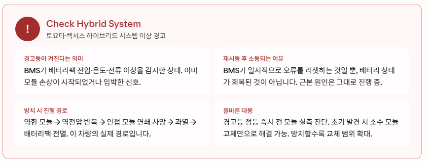 - Check Hybrid System 경고등 점등 → 즉시 모듈 전수 진단. 방치할수록 교체 범위와 비용이 기하급수적으로 증가