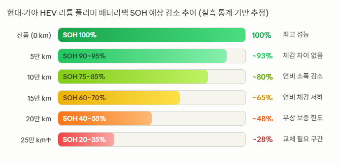 - 경고등 없어도 연비 저하 체감 시 → 경고등 이전에 이미 SOH 50% 이하일 수 있음