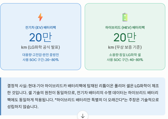 핵심 요약: LG화학(현 LG에너지솔루션)은 전기차용 리튬이온 배터리팩 수명을 약 20만 km로 공식 발표했습니다. 현대·기아 하이브리드카에 탑재되는 배터리팩도 동일한 LG화학 리튬이온 폴리머 셀로 제조됩니다. 따라서 "하이브리드 배터리는 반영구적"이라는 주장은 기술적 근거가 없으며, 주행거리와 연식에 따른 성능 저하는 필연적입니다.