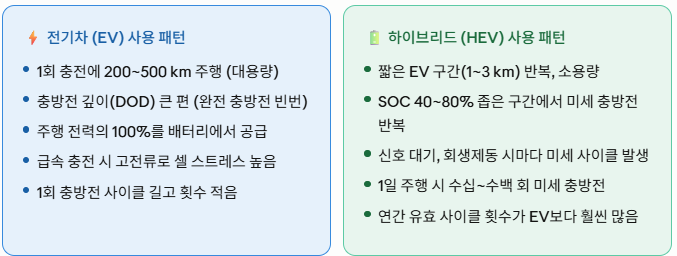 EV vs HEV 배터리 사용 패턴 비교 — 수명에 미치는 영향