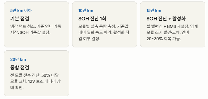 - 5만 km마다 냉각 덕트 청소 → 배터리 수명 연장에 직접 기여
