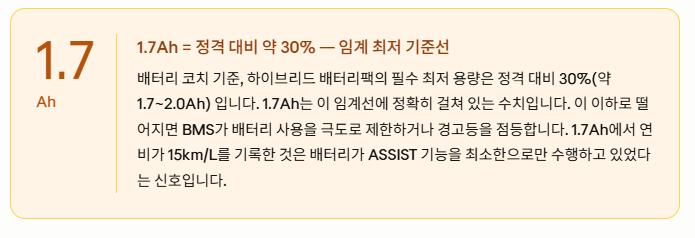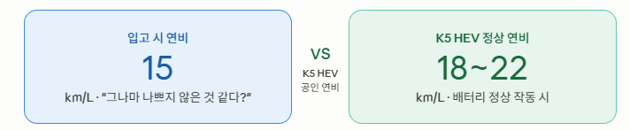 15km/L를 "나쁘지 않다"고 생각하면 안 되는 이유: K5 하이브리드의 공인 도심 연비는 18~22km/L 수준입니다. 15km/L는 정상 대비 25~30% 낮은 수치로, 이미 배터리 ASSIST가 크게 제한된 상태입니다. 가솔린 K5 비하이브리드의 도심 연비(약 10~12km/L)보다는 낫지만, 하이브리드 프리미엄을 온전히 누리지 못하는 상태입니다. 15km/L는 "괜찮다"가 아니라 "배터리가 이미 상당히 약해진 신호"입니다.
