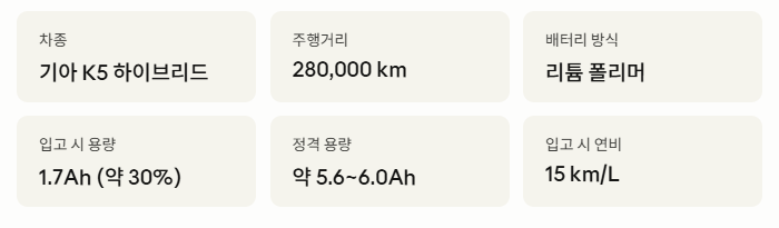 28만 km K5 하이브리드 배터리팩 1.7Ah — 성능 회복으로 완충까지, 연비 15km/L의 진실