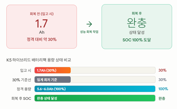 핵심 요약: 28만 km를 주행한 K5 하이브리드가 배터리팩 용량 1.7Ah(정격 대비 약 30%)로 연비 15km/L 상태에서 입고되었습니다. 성능 회복 작업(활성화 충전 + 셀 밸런싱) 후 배터리팩이 완충 상태에 도달했습니다. 단기 회복 효과는 확인되었으나, 28만 km 차량의 구조적 열화 한계와 이후 관리 방향을 솔직하게 설명합니다.