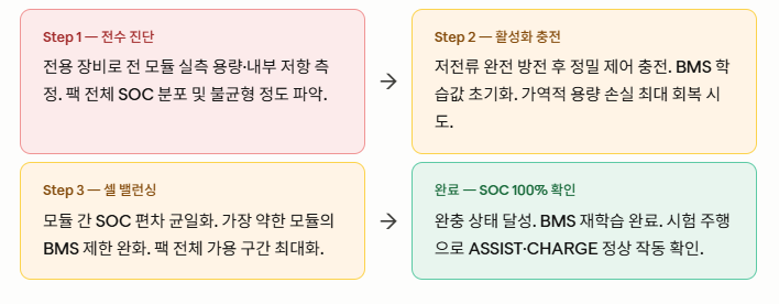 실측 팩 용량이 1.7Ah라 해도, BMS가 학습한 SOC 추정 기준값이 왜곡되어 있으면 실제 가용 구간이 더욱 좁아집니다. BMS가 "실제로는 50% 남은 상태"를 "10% 남았다"고 잘못 판단하면 훨씬 이른 시점에 ASSIST를 차단합니다. 성능 회복 작업의 핵심 효과 중 하나가 이 BMS 학습값 왜곡을 교정해 실제 가용 용량을 최대한 활용 가능하게 만드는 것입니다.